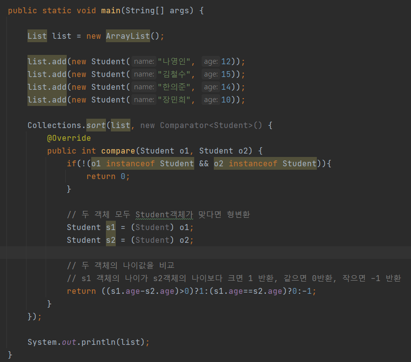 설명이 어렵다면 이제 나이를 기준으로 새로운 정렬 기준을 만들어주기 위한 Comparator를 실습해보자.