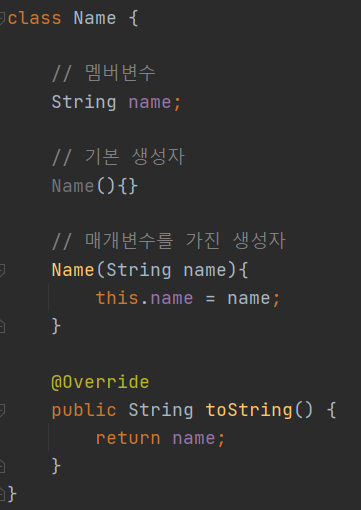 멤버 변수라곤 Name하나에 생성자 두개, toString 메서드로 구성된 간단한 클래스다.