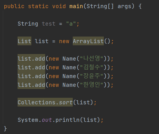 반면 이전에 만들어둔 클래스인 Name에는 Comparable, ComparaTo() 모두 구현하지 않았다.