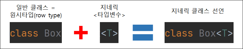 일반적인 클래스 선언에 지네릭을 붙이고 안에 타입 변수를 넣어주면 지네릭 클래스가 선언되는 것이다.