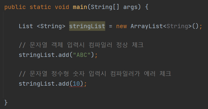 위 그림을 해석하면 stringlist라는 ArrayList는 앞으로 String문자열 객체만 저장 가능하다는 뜻이다.