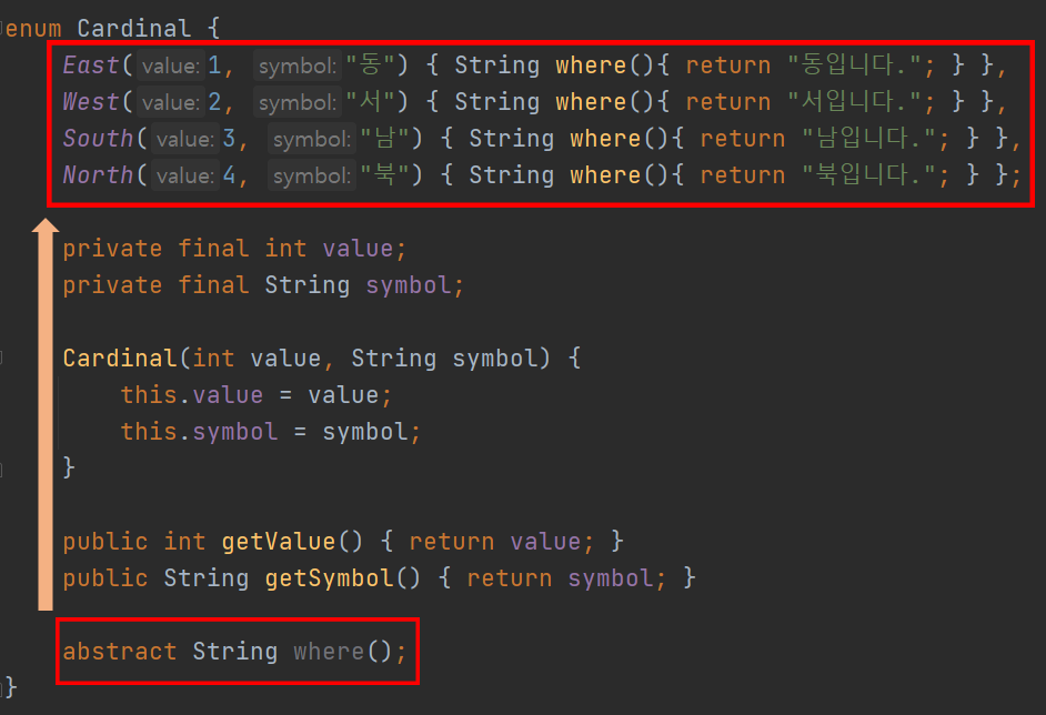이렇게 할 경우 enum 안의 모든 상수는 상속클래스처럼 이 추상 메서드를 구현할 의무를 갖는다.