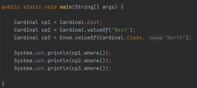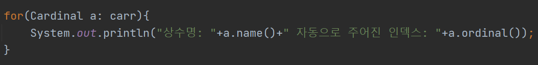 Cardinal 변수인 a만 출력해도 되고, enum 조상 클래스가 제공하는 name()과 ordinal()을 사용해도 된다.
