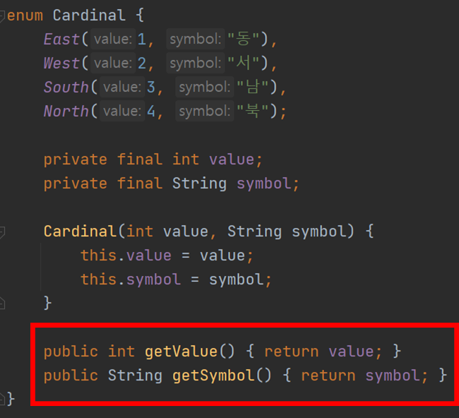 만약 각 상수에 저장된 값을 불러오고 싶다면 get메서드를 추가해주면 된다.