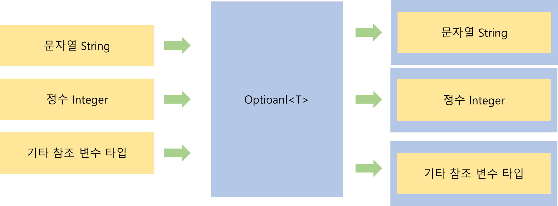 Optioanl 클래스는 모든 참조 변수 객체를 그림과 같이 감싸서 활용할 수 있도록 도와준다.