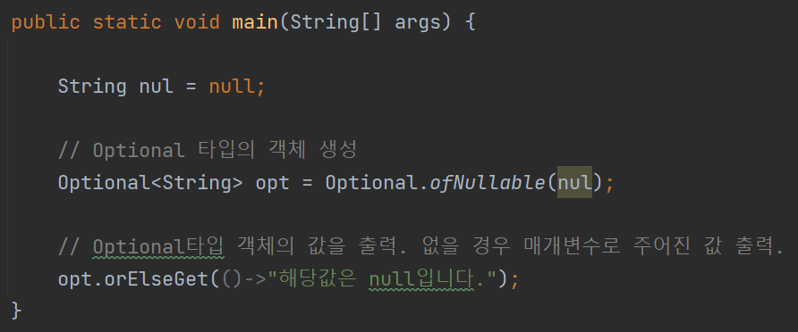 - orElse() : 객체가 가진 값이 null일 경우 인자로 전달된 값 반환