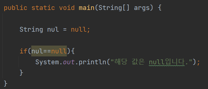 변수 nul은 null을 가지고 있기 때문이다. 그렇다면 이 코드에서 NullPointException이 발생하지 않도록 해보자.