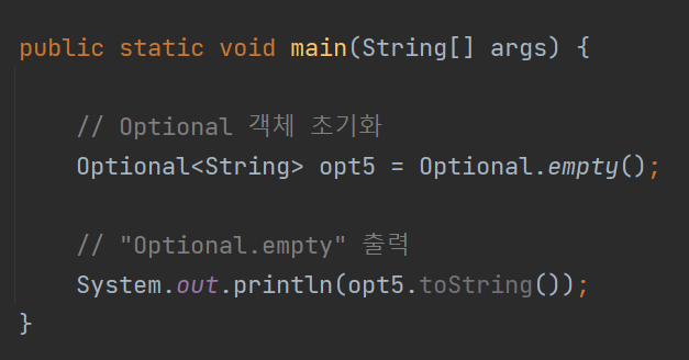 - isEmpty() : 해당 메서드는 Optional 객체의 값이 비었는지 확인 하는 것. 값이 없다면 true를 반환한다.